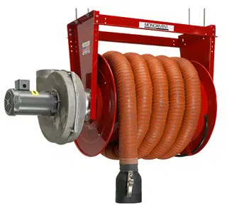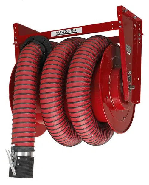 Monoxivent’s Hose Reel exhaust systems are the premier solution for vehicle exhaust fume extraction. Hose Reel workshop exhaust extraction systems offer a convenient and efficient method for extracting harmful emissions from all types of working environments. Hose Reels are either Motor Operated or Manual Spring Retractable. The Reels are offered in standard 4-, 5-, 6-, and 8-inch exhaust removal hose diameters. Oversized Hose Reels within the XL SERIES are offered with 24″- and 36″-diameter drums. The XL reels accommodate between 8″ and 18″ diameter hose. The Reels are supplied completely assembled and ready for installation. The reels may be connected with ductwork to a central exhaust system or smaller reels may be supplied with a direct mount fan. Whatever your type of vehicle exhaust removal system you require, Monoxivent can help you effectively remove the fumes.